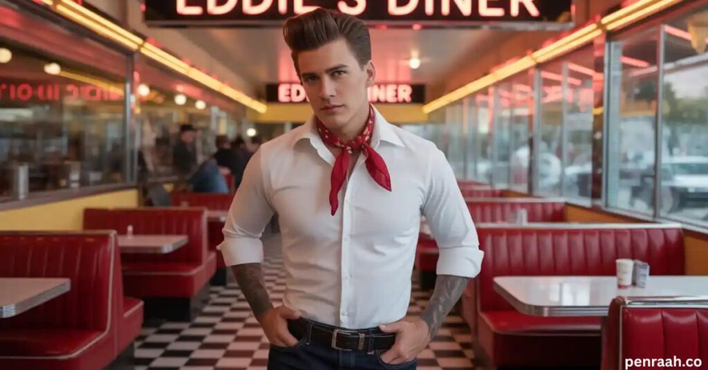 Rockabilly fashion for men is incomplete without the iconic pompadour hairstyle. This classic hairstyle involves sweeping the hair upwards and backward, creating volume at the front. The look adds a polished yet edgy vibe, perfectly complementing the leather jacket and skinny jeans. While the pompadour is associated with Elvis Presley, many rockabilly enthusiasts continue to rock this hairstyle in modern times, making it a signature part of the style.